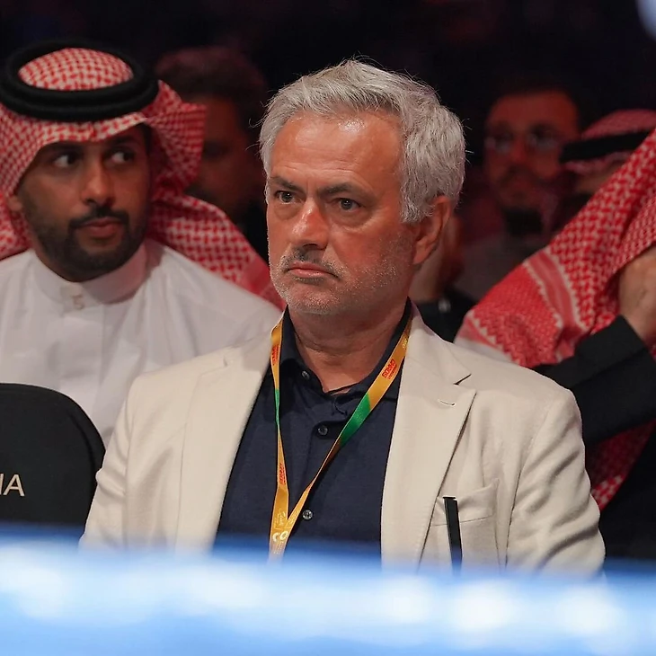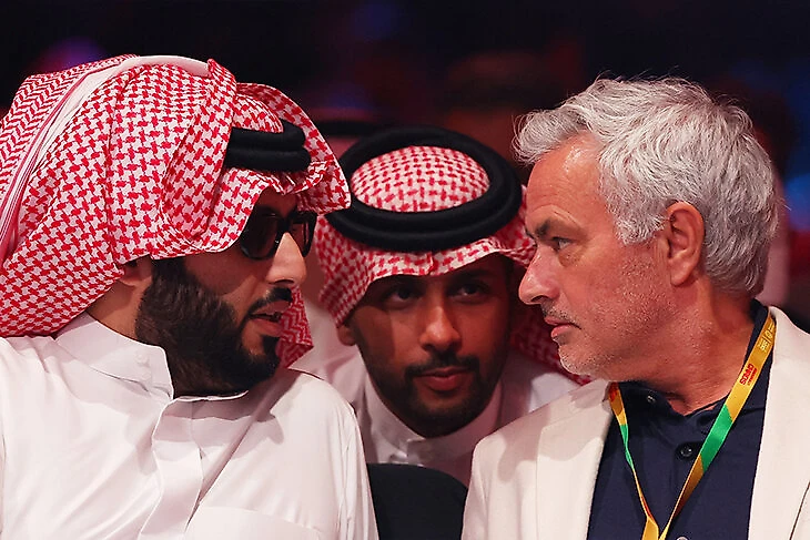 • Понятно, что появление Моуринью вряд ли бы было возможным без Турки Аль аш-Шейха, который организовал турнир. Кажется, взгляд Моуринью на что-то намекает.