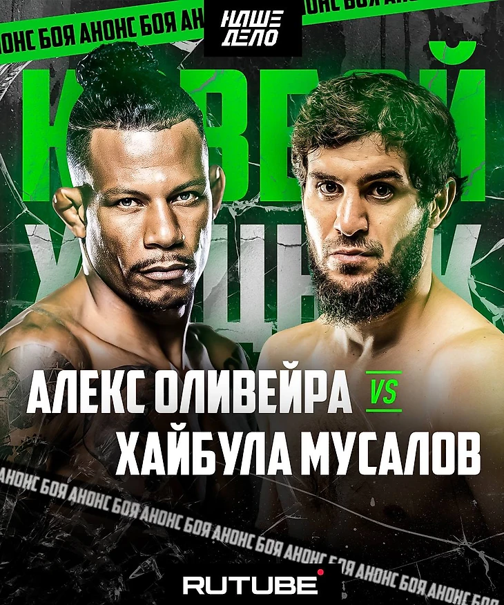 Российский непобежденный боец смешанного стиля (ММА) Хайбула Мусалов по прозвищу «Хищник» проведет поединок на турнире «Наше Дело» 83, который пройдет в мае этого года. Его соперником станет экс-боец UFC из Бразилии Алекс Оливейра. Экс-боец UFC, который провёл в сильнейшей лиге мира 22 поединка, топ-15 полусреднего веса бразильский «Ковбой» Алекс Оливейра устроит серьёзную проверку одному из лучших кулачных бойцов, сотворившему успешный переход в ММА Хайбуле «Хищнику» Мусалову Бой пройдет по правилам ММА, 3 раунда по 5 минут. Хайбула Мусалов имеет 7 побед, 0 поражений в поединках на голых кулаках, в ММА одержал 2 победу и не потерпел поражений . Оливейра одержал 24 победы, 11 из которых в Абсолютном бойцовском чемпионате (UFC), потерпел 14 поражений, 1 бой завершил вничью В своем последнем поединке бразилец уступил россиянину Александру Шлеменко удушающим приемом в первом раунде.