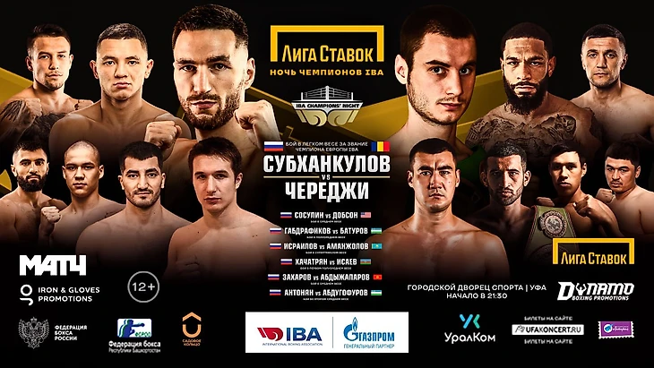 В главном бою шоу «Лига Ставок. Ночь чемпионов IBA» россиянин Артур Субханкулов (6-0, КО 4) встретится с румыном Джеймсом Череджи (19-4, КО 7) в 10-раундовом поединке за пояс чемпиона Европы по версии IBA в весе до 60 кг.