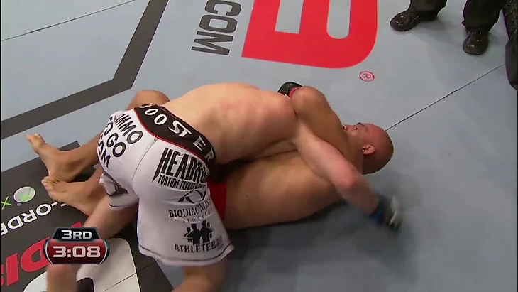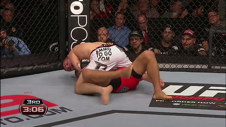 Хабиб проходит открытый гард Шалоруса и выходит в боковой контроль. Время на таймере: 3:08