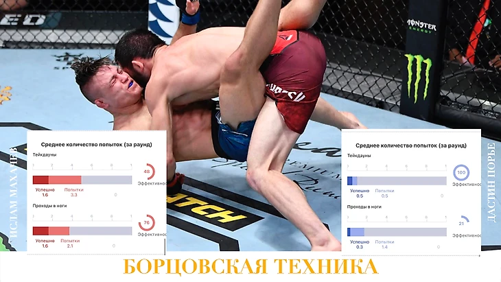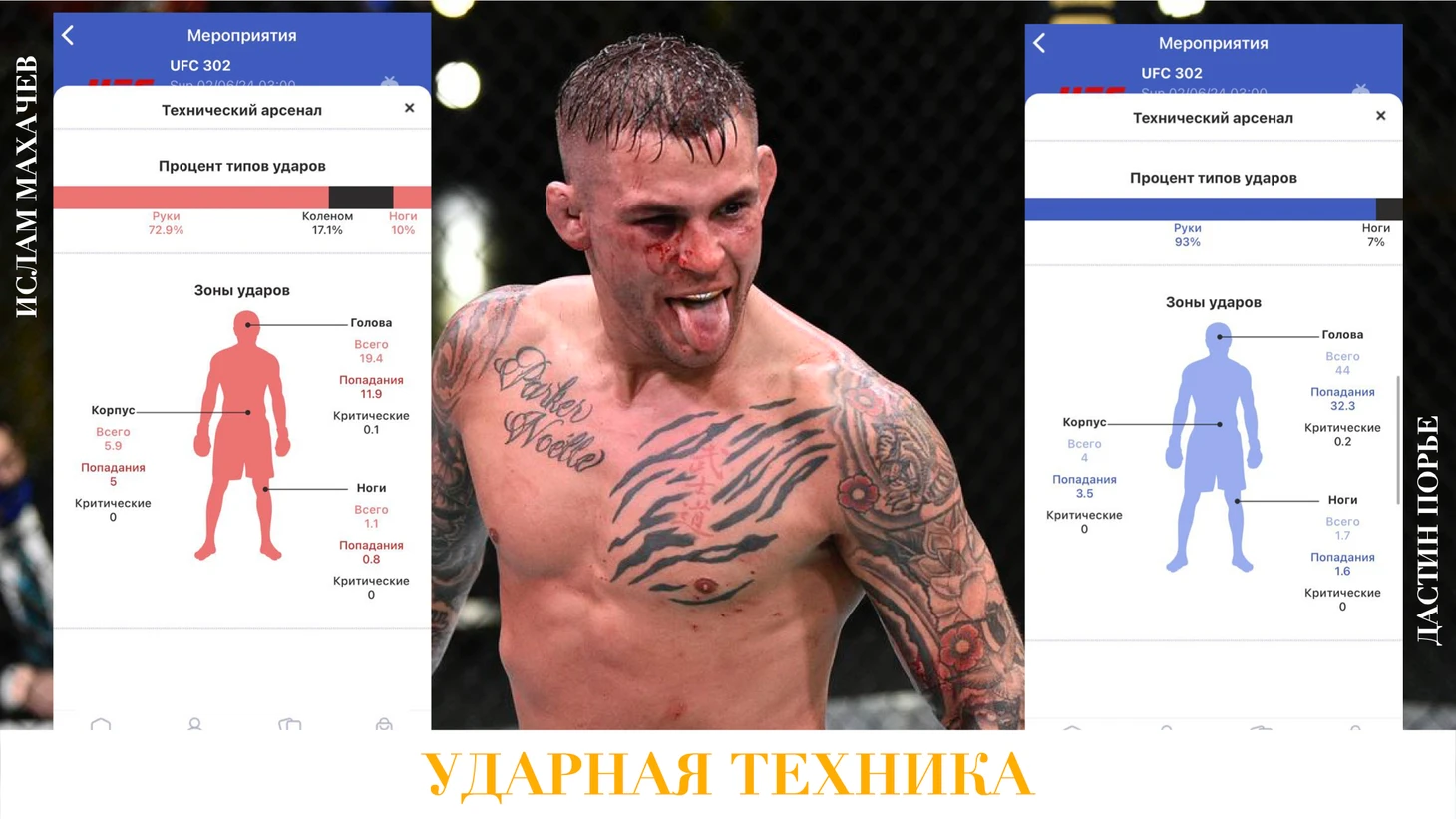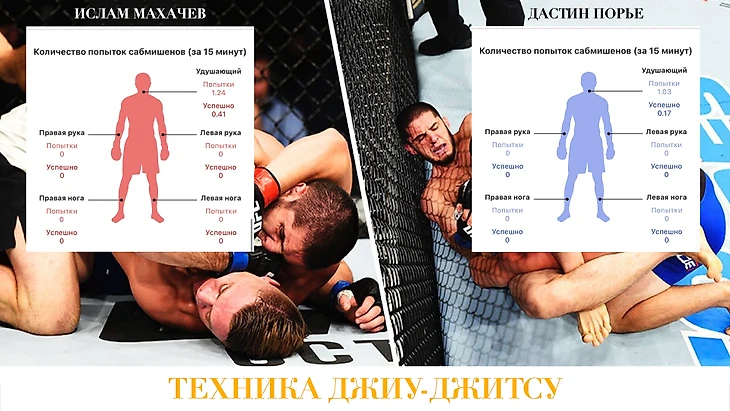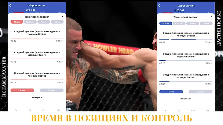 Цифры говорят, что у Махачева преимущество в борцовской технике, технике джиу-джитсу и в контроле в Партере, где Ислам чувствует себя как в воде. Порье же уверенно себя чувствует в Стойке, где показывает более интенсивную и эффективную ударную технику.