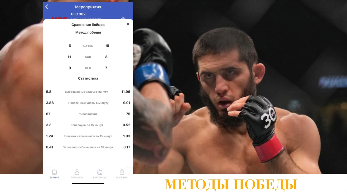 В среднем Ислам выбрасывает 5,8 ударов в минуту из них попадает 3,88 (67% эффективность), Дастин - выбрасывает 11,7 и попадает 9 (75%).