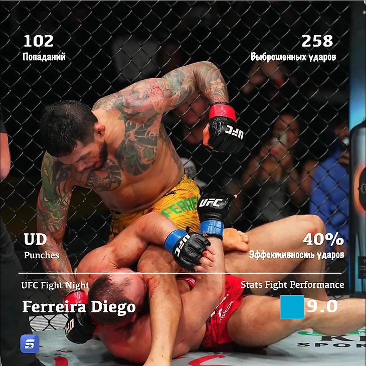Четвертое место занимает Ferreira Diego на UFC Fight Night, который прошел 12 мая 2024г. Stats Fight Perfomance в поединке составил 9,0