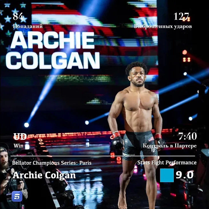 3 место занимает Colgan Archie и его поединок на Bellator Champions Series в Париже, Stats Fight Perfomance - 9,0
