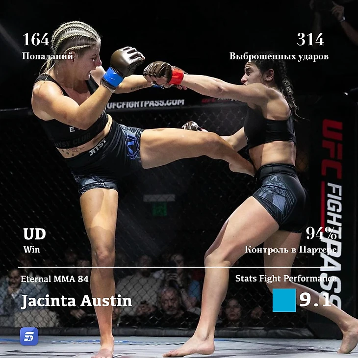 Второе место занимает представитель женского ММА - Jacinta Austin и её выступление на Eternal MMA в Австралии. Stats Fight Perfomance - 9,1