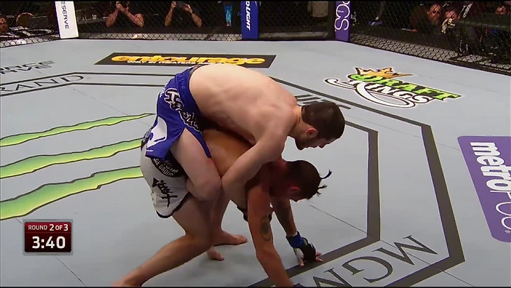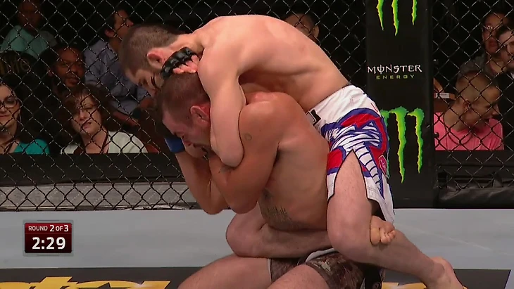 Исламу удается сделать захват для кимуры, но для завершения болевого не хватает контроля головы ногой. Хабиб из угла напоминает об этом