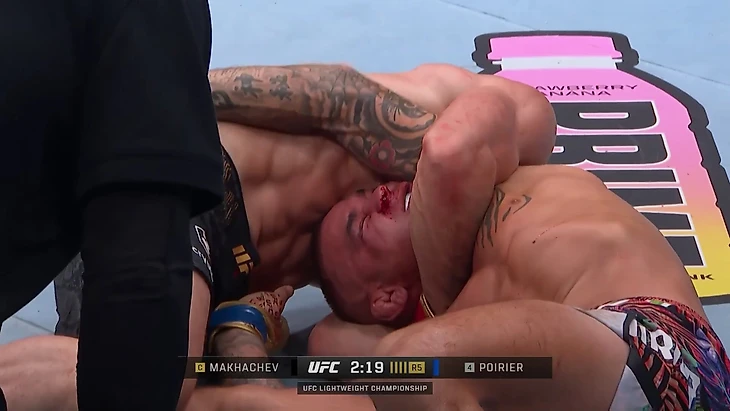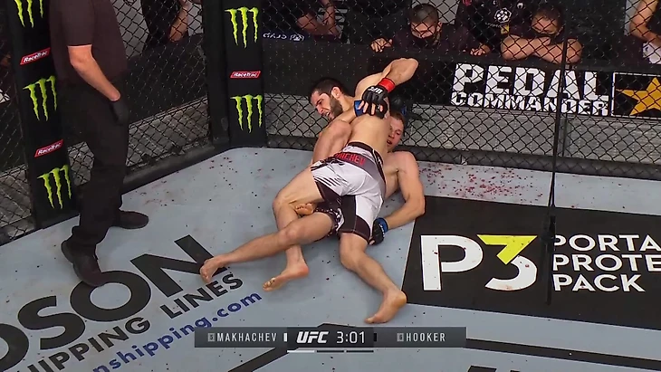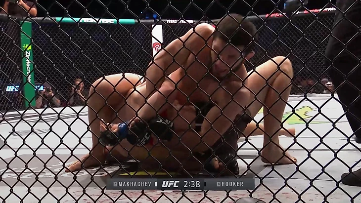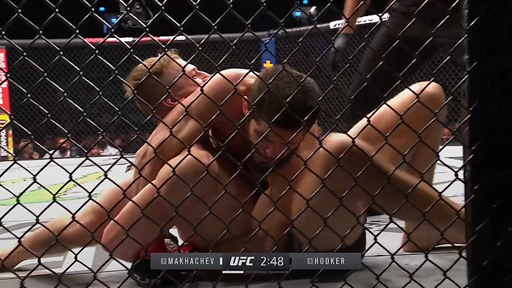Обеспечив контроль головы, Махачев докручивает локоть, после чего Хукер сдается