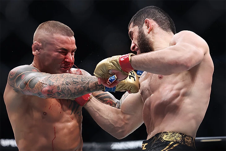 Дастин Порье проиграл Исламу Махачеву на UFC 302 в бою за титул в легком весе. Все закончилось в пятом раунде удушающим, хотя перед этим мы увидели зрелищную перестрелку в стойке – оба бойца закончили поединок с окровавленными лицами.