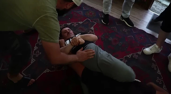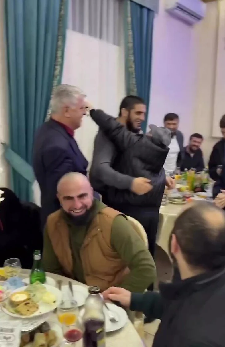 Там Раджаб выступил с речью перед собравшимися болельщиками, держа пояс UFC, праздновал с Махачевым победу в ресторане, попал от него под обстрел из водяного пистолета и даже замахивался вилкой после гениального диалога: