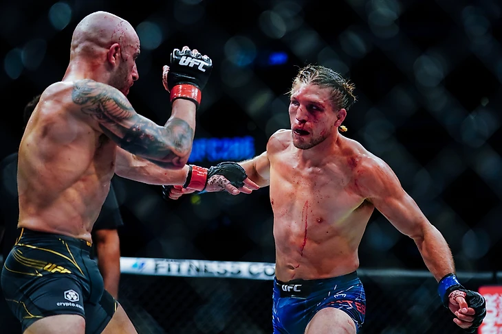 Диего Лопес набирает популярность с космической скоростью. Он дебютировал в UFC чуть больше года назад и уже подрался на юбилейном UFC 300, оформил три досрочных победы подряд и едва не засабмитил Мовсара Евлоева на коротком уведомлении. Помимо забавной прически, Лопес выделяется острым джиу-джитсу и большой силой удара в клинче и на дистанции.