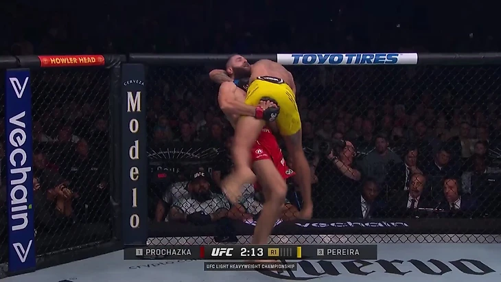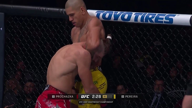 Но он совершает ошибки. Например, в двух первых поединках в полутяжелом весе Перейра в ответ на попытку перевода у сетки опрометчиво пошел за гильотиной в стойке – оба раза это закончилось пропущенным тейкдауном. Пример из боя против Прохазки: