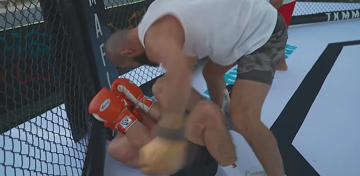 Но все пошло для Литвина гораздо хуже. Он вышел в защитном шлеме и кроссовках и сразу же оказался загнанным к сетке плотной серией ударов. Чимаев обрабатывал корпус Литвина, пока тот не оказался на канвасе. После одного из ударов по печени рефери остановил импровизированный поединок.