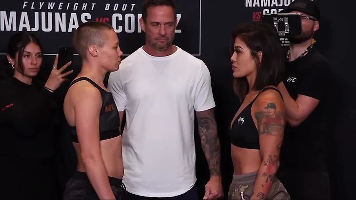 Женский наилегчайший вес: №6 Роуз Намаюнас – №11 Трэйси Кортез (главный бой вечера) В последнее время Роуз не показывает выдающихся результатов. Большинство её поединков были скучными, и почти все из них доходили до решения судей. Своими финишерскими навыками не славится и Трэйси. Ход поединка довольно легко предсказать. Намаюнас будет бегать по октагону и пытаться отстреливаться в стойке. Кортез, в свою очередь, будет преследовать её и пытаться перевести в партер, а там просто будет лежать и обозначать активность. Досрочная победа здесь практически невозможна.