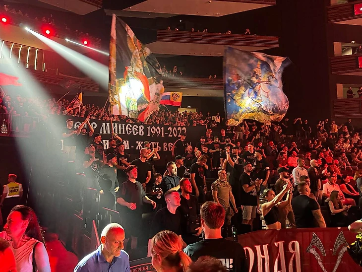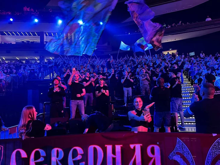 На Северной трибуне болели ярко, как на футболе. Стяги с Александром Невским, имперские флаги и опытные фанаты, знающие тексты: