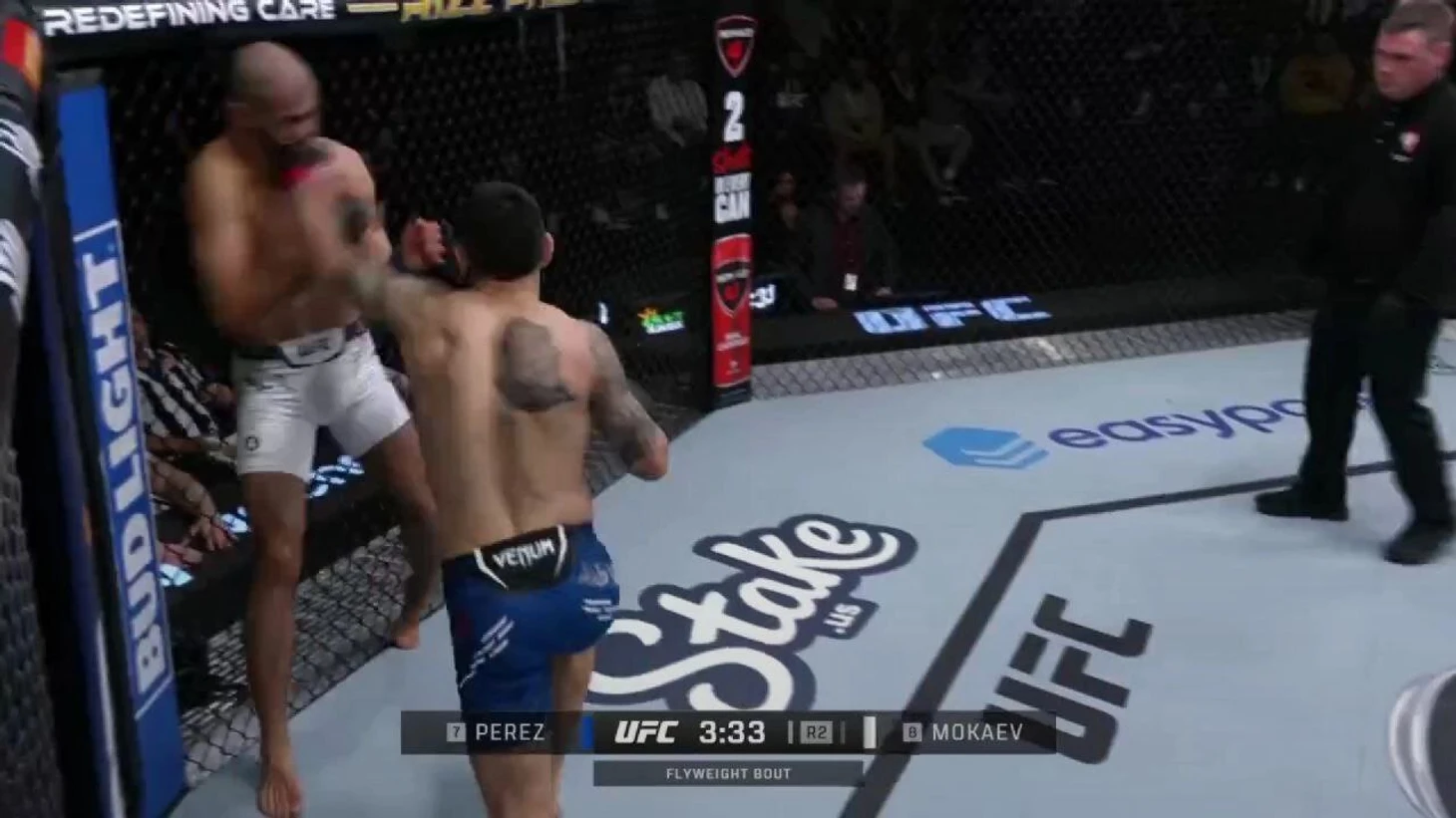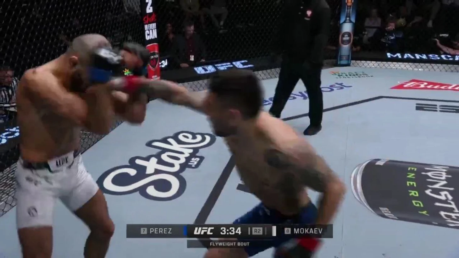 Алекс Перес идет вперед с ударами. Мокаев держит руки у головы – пока все нормально