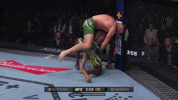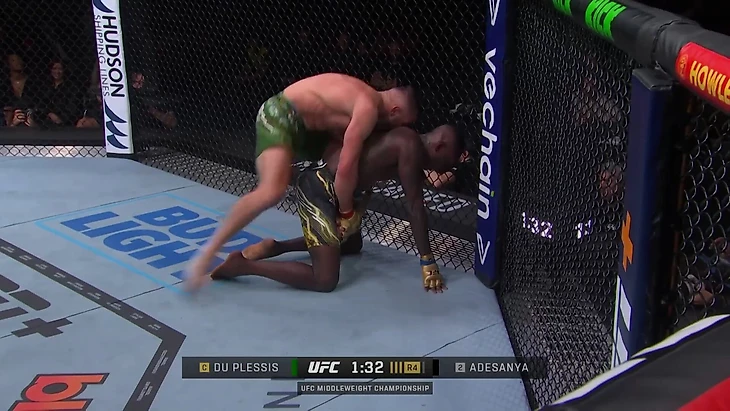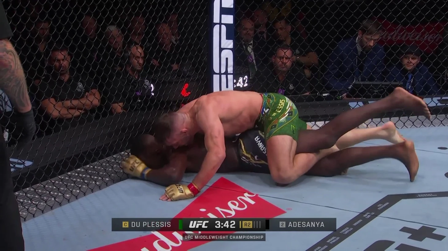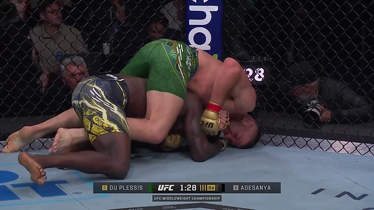 Но в четвертом раунде все поменялось за 20 секунд: дю Плесси несколько раз попал правой рукой по убегающему Адесанье, перевел его в партер и закрыл удушающий сзади.