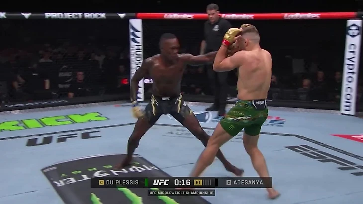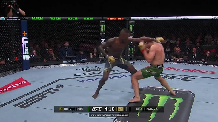 Адесанья с первых секунд показал, на что ставит в этом поединке. Кики, джебы, длинные прямые удары – классический набор приемов Иззи. Изменился подход к контролю клетки: Адесанья намеренно пошел на дю Плесси с давлением. Так он не давал сопернику возможности делать проактивные тейкдауны и оставлял пространство за спиной для отступления в случае агрессивных сближений дю Плесси.