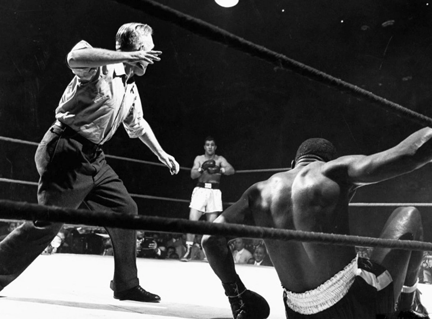 Невысокий цветной мужчина слева от меня ободряюще крикнул: «Давай, Сэтчел!» — это отсылка к Сэтчелу Пейджу, бейсбольному питчеру высшей лиги, который был даже старше Уолкотта, но порой выручал в трудных ситуациях. В его голосе не было большой убежденности, как и в манере поведения Уолкотта. В сентябре я видел, как Уолкотт вышел и побил Марчиано. Но на этот раз он не бил и не ускользал, а просто отступал. И Марчиано, никогда не отличавшийся быстрым стартом, не мог придумать, что делать, кроме как идти за ним. Когда он подходил ближе, Уолкотт хватал его за руки. Похоже, это был тот бой, на котором мы все могли успокоиться. Волнение, если и возникнет, то только в поздних раундах. Темп был настолько медленным, что я пару раз взглянул на большие часы, отмеряющие каждый трехминутный круг. Уолкотт нанес Марчиано пару ударов левой, когда тот отступал, но он уходил так быстро, что они не достигли цели. Марчиано пропустил пару ударов справа, которые были настолько неуклюжими, что я подумал, что это финты, призванные вызвать противодействие. И если да, то они потерпели неудачу. Затем, когда двое бойцов копошились в углу Марчиано, а чемпион стоял спиной к нашей стороне, я увидел, как Рокки нанес сильный удар слева, и Уолкотт упал на пол. Уже потом я узнал, что Марчиано провел восходящий правый удар в челюсть сразу после левого, но с того места, где я сидел, я не видел, куда он пришелся. Поэтому я просто предположил, что Джерси Джо был сбит с ног ударом слева.