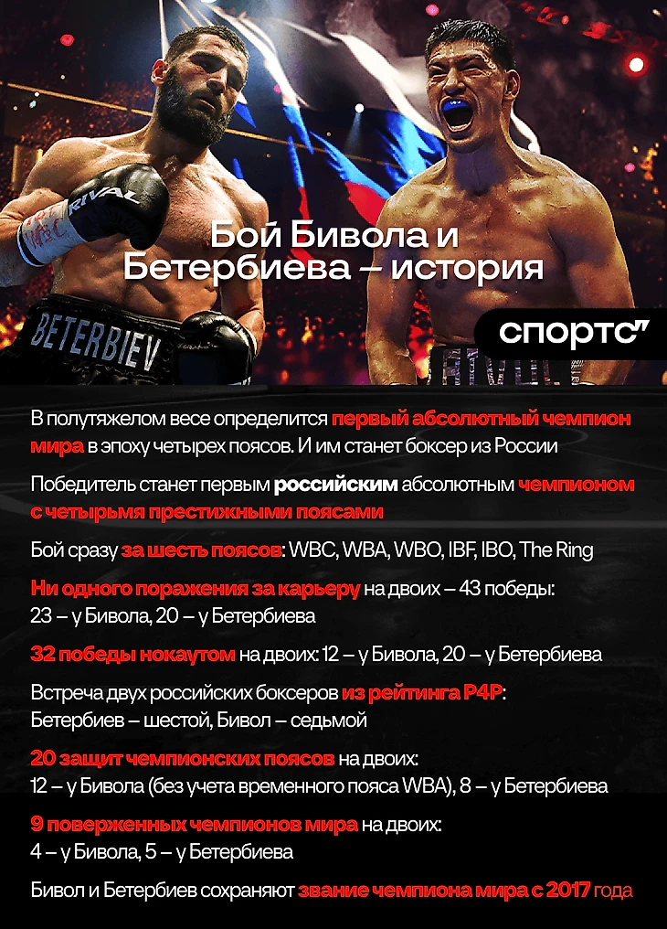 Противостояние техники и силы, 43 победы на двоих и ни одного поражения – уже скоро определится первый абсолютный чемпион среди полутяжей из России, хотя сами боксеры не считают противостояние принципиальным. Бивол выиграл 23 поединка из 23 (12 – нокаутом), Бетербиев – 20 из 20 (все – нокаутом). Кто лишится нолика?