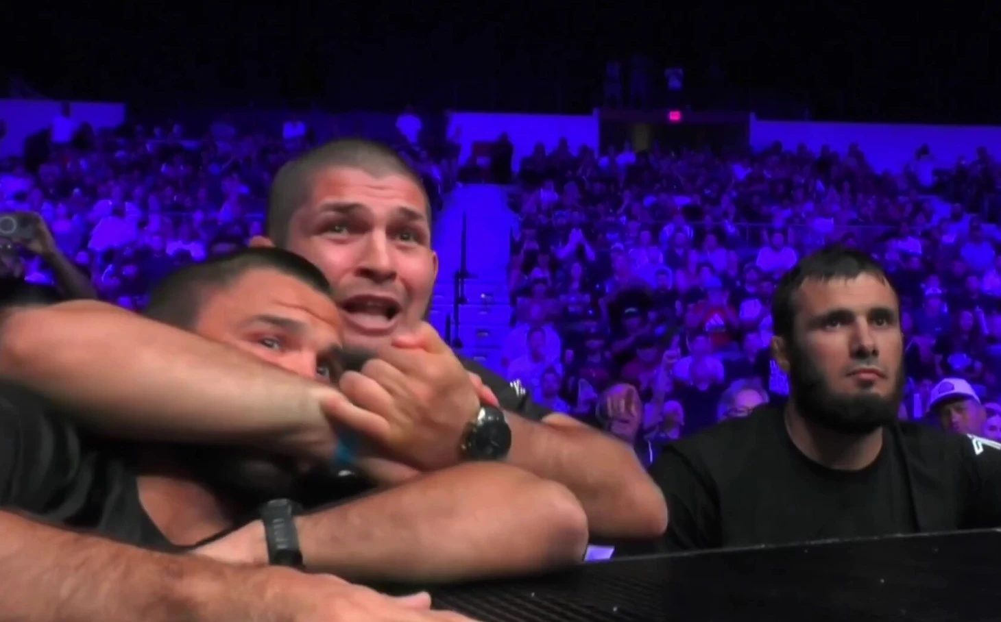 В самый интенсивный момент поединка, когда Усман попал по Шаблию хай-киком и пошел за удушающим, Хабиб так переживал за младшего брата, что сам начал заламывать шею попавшемуся под руку Умару.