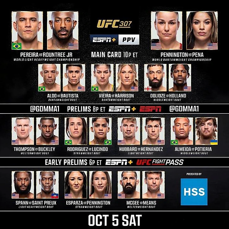 Изначально казалось, что UFC 307 станет проходным – этакой промежуточной остановкой между UFC 306 в «Сфере» и UFC 308 в Абу-Даби. Однако, глядя на кард, можно сказать, что UFC подготовили нам приятный сюрприз. Здесь нет по-настоящему громких боев (изначально на эту дату планировался «титульник» в полулегком весе между Топурией и Холлуэем), однако кард, в целом, плотный. Поединков, которые можно было бы назвать проходными, практически нет. Открывать турнир доверили ветеранам Тиму Минсу и Курту МакГи, закроют прелимы бойцы из топ-15 полусреднего веса Стивен Томпсон и Хоакин Бакли, а в основном карде будет интересно посмотреть: удастся ли Кайле Харрисон пройти Виейру также уверенно, как Холли Холм, получится ли у Жозе Алдо одолеть второго проспекта подряд и, на закуску, нас ждет схватка двух нокаутеров – Алекса Перейры и Халила Раунтри.