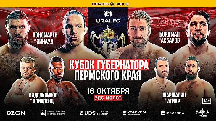 Возглавит шоу Ural FC 8 бой в тяжелом весе между россиянином Сосланом Асбаровым и британцем с британцем Робертом Бордманом. Всего в рамках турнира «Кубок Губернатора Пермского Края» 16 октября состоятся 12 поединков по правилам ММА и кикбоксинга, которые будут транслироваться в прямом эфире в онлайн-кинотеатре KION.