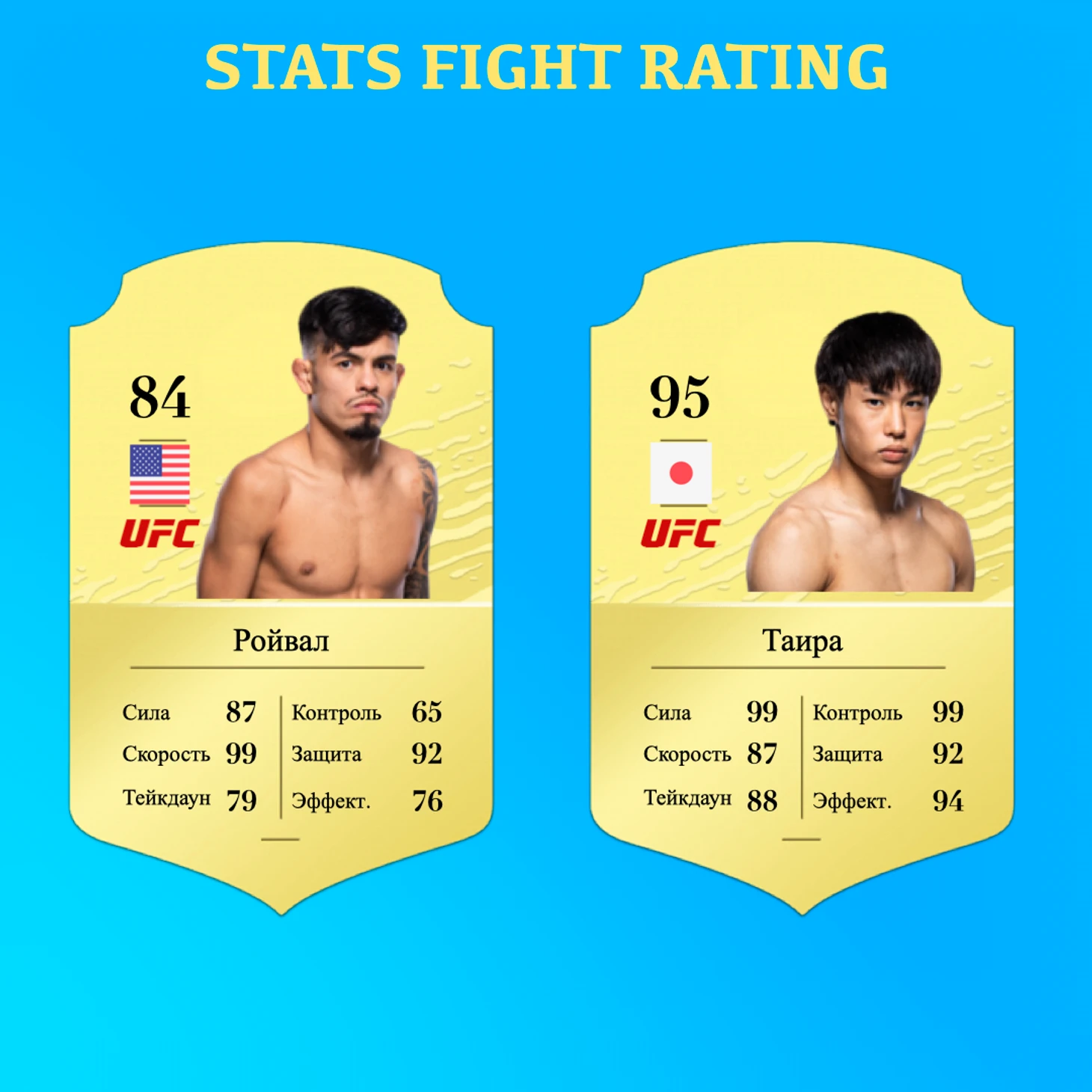 По данным Stats Fight Rating, бойцовский уровень Таиры выше, чем у Ройвала. Рейтинг японского файтера составляет 95. Американец имеет рейтинг 84.
