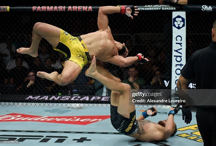 Есть бойцы, которые для развлечения публики исполняют сальто в октагоне после победы. А есть Мишель Перейра, он исполняет сальто прямо во время боя, проходя таким способом гард лежачего оппонента. В целом, этого факта достаточно для понимания того, что за это боец.