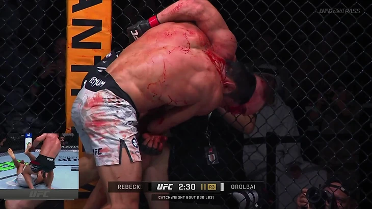 Множественные плотные попадания левой рукой нанесли приличный урон. Под конец первого раунда правый глаз совсем закрылся – несмотря на все старания катмена, огромная гематома становилась все больше и больше. В перерыве между раундами рефери вызвал врача в клетку. Тот осмотрел Оролбая, проверил видимость глаза и разрешил продолжить поединок.