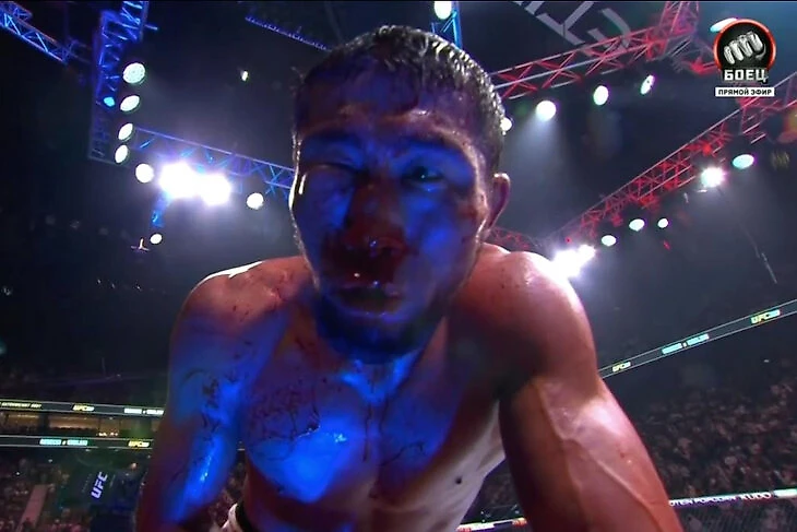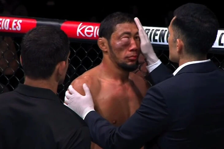 В первом же раунде у Оролбая почти закрылся глаз из-за гематомы. В третьем все превратилось в кровавое месиво