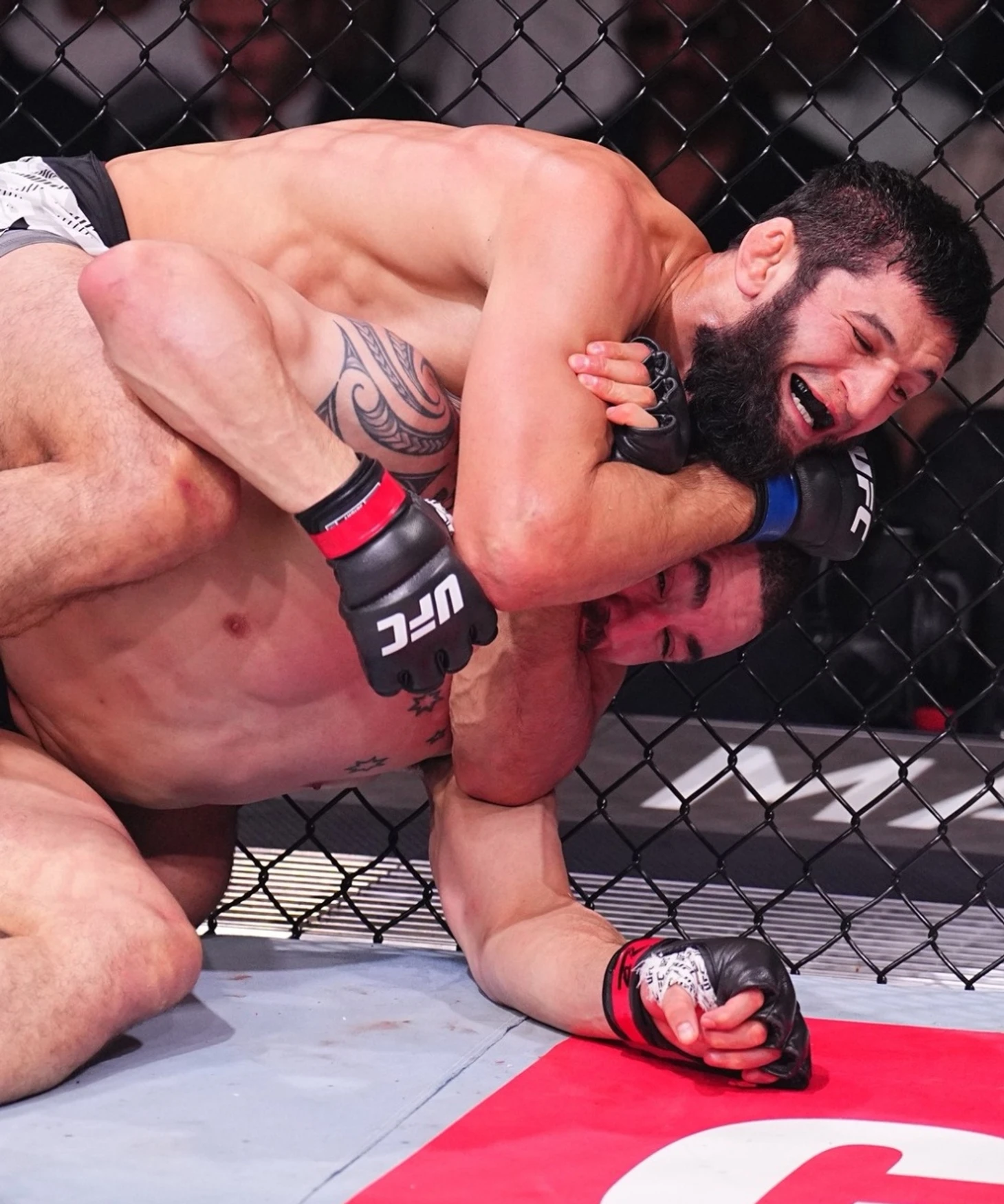 Как и ожидалось, Чимаев практически сразу же перевёл Роберта Уиттакера в партер. Главной интригой было то, сможет ли Роберт затянуть соперника в поздние раунды. Но Роберт не смог. Весь первый раунд Хамзат без труда удерживал его на настиле октагона, при этом ударов со стороны Чимаева почти не было. Уже в конце первого отрезка боя Хамзат провёл болевой приём. Это был не удушающий, а именно болевой приём на челюсть. Уиттакер от боли постучал моментально, а Чимаев в послематчевом интервью рассказал, что слышал нечто, похожее на хруст. Страшное фото открытого рта Роба уже успело облететь весь интернет. И не трудно догадаться, с какой силой шведский боец чеченского происхождения, выступающий сейчас под флагом ОАЭ, надавил на челюсть австралийцу.