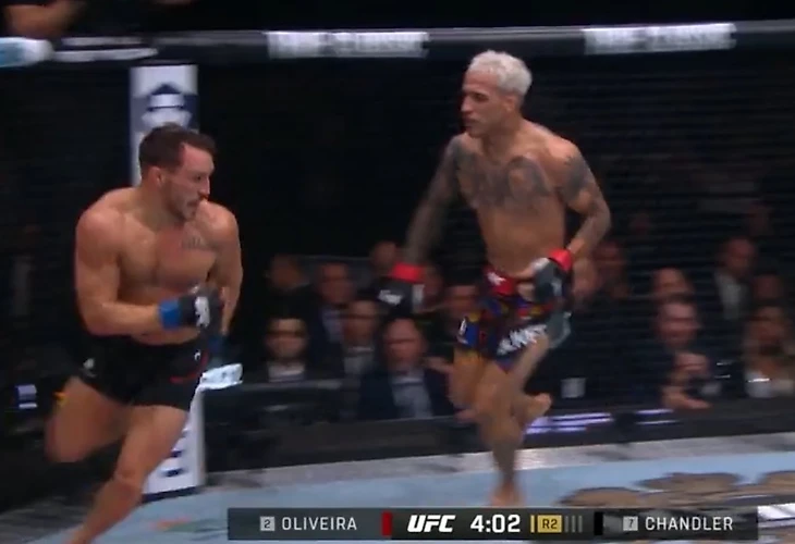 Во втором раунде Чендлеру пришлось бегать от Оливейры, который зажал его у сетки, по октагону: