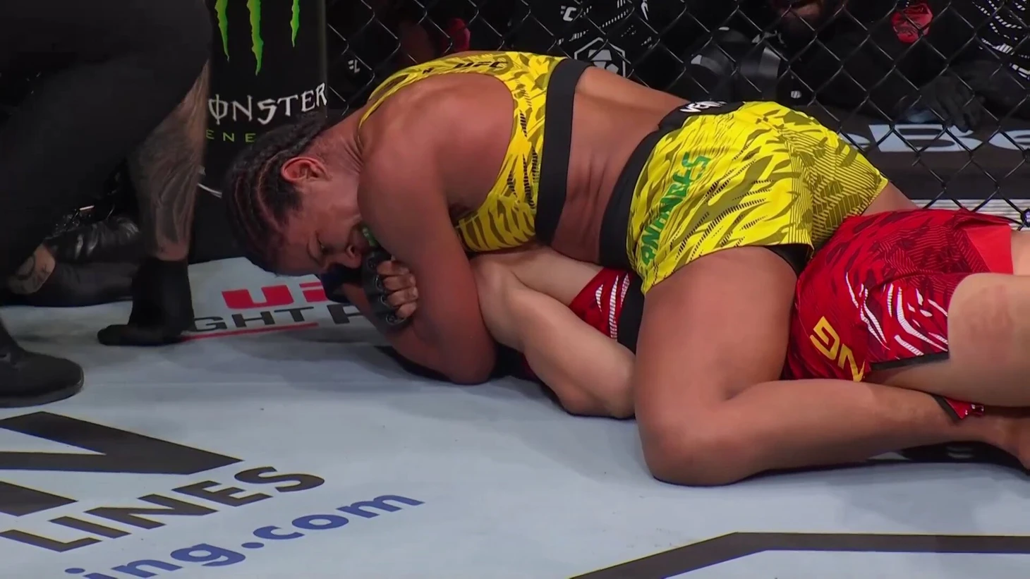 Пытаясь уйти от добивания, Конг повернулась спиной и запустила соперницу в идеальную позицию. Джитсерша Фернандес моментально этим воспользовалась: