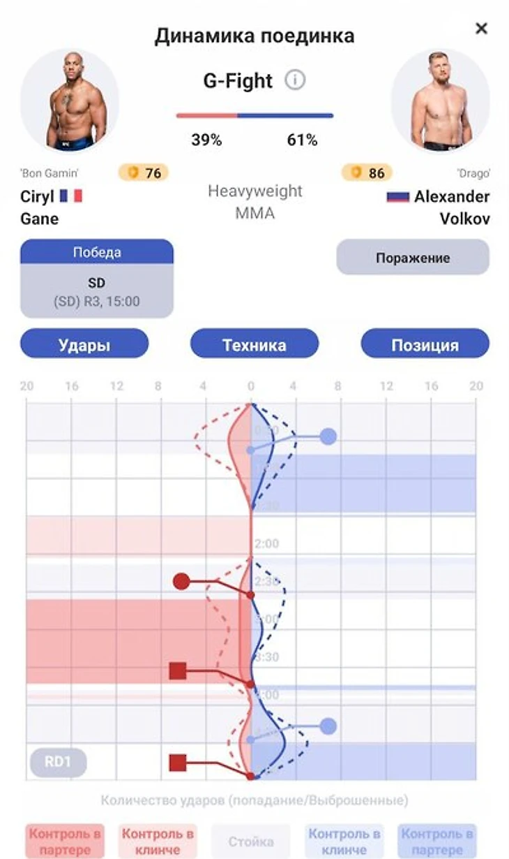 Согласно данным G-Fight, Волков забрал оба раунда, причем с достаточно высокой долей вероятности – 57/43 и 70/30 в пользу россиянина.