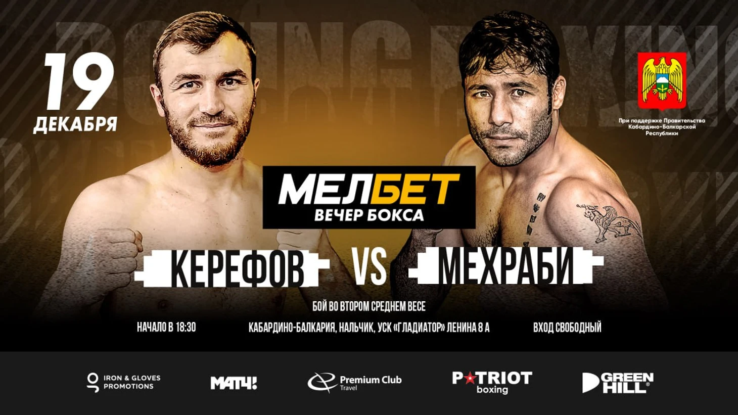Российский боксёр Тимур Керефов (13-1, КО 7) 19 декабря в Нальчике проведёт бой против иранца Саджадом Мехраби (5-3-2, КО 4). Этот 10-раундовый бой во втором среднем весе возглавит турнир «Мелбет. Вечер профессионального бокса», организованный Iron&Gloves Promotions, PATRIOT Boxing при поддержке правительства Кабардино-Балкарской Республики, Федерации бокса Кабардино-Балкарской Республики и Федерации бокса России.