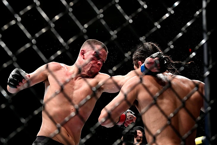 Легко защитившись от тейкдауна, Нейт забрал спину Конора и закрыл удушающий сзади. Окровавленный Диаз, позирующий перед камерами, подарил миллионам фанатов новую крутую аватарку и, возможно, один из самых крутых комментариев после боя: «Я не удивлен, ублюдки».