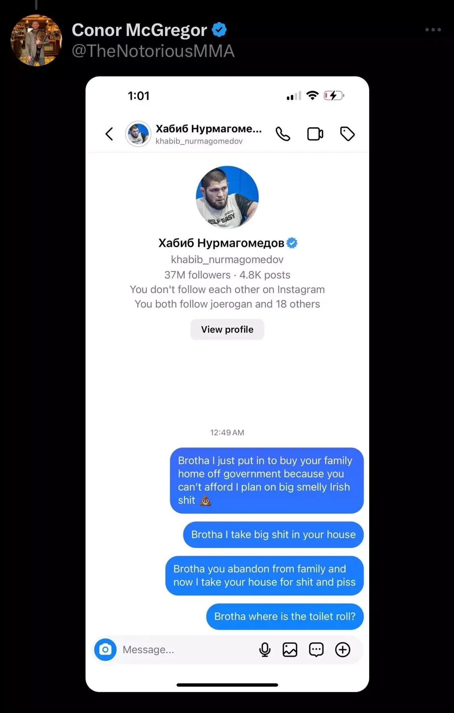 На ситуацию отреагировал Конор Макгрегор: «Брат, я только что вложил деньги, чтобы выкупить у правительства дом твоей семьи, потому что ты не можешь себе этого позволить. Брат, я устрою большое дерьмо в твоем доме. Ты бросил семью, и теперь я разнесу твой дом в пух и прах». А потом даже написал Хабибу в личные сообщения: «Братан, я выкуплю твой дом, чтобы насрать там».