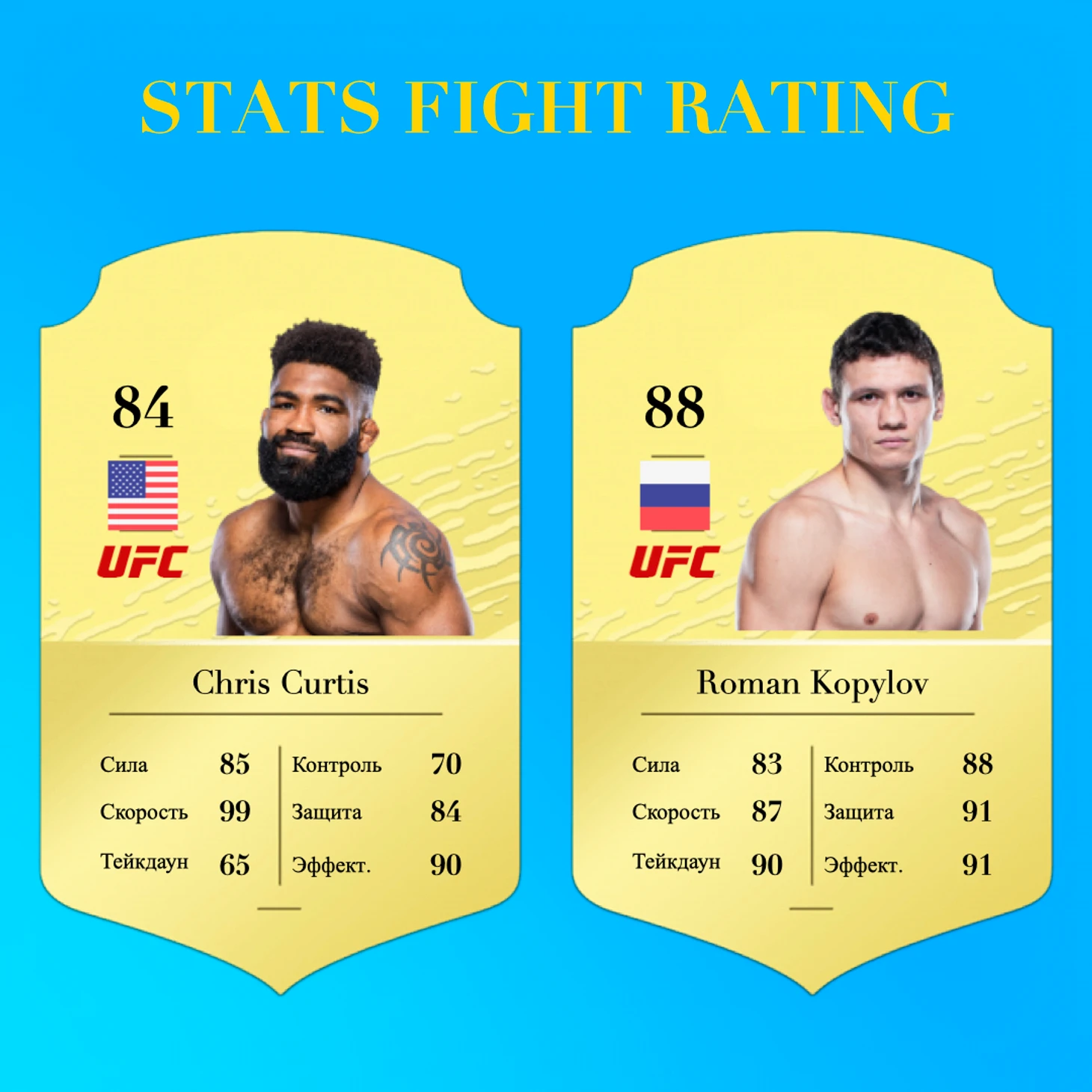 По данным Stats Fight Rating, бойцовский уровень Романа Копылова выше, чем у Криса Кертиса. Навыки российского файтера оцениваются рейтингом 88. Что касается американца, то его сила и характеристики наделены рейтингом 84.