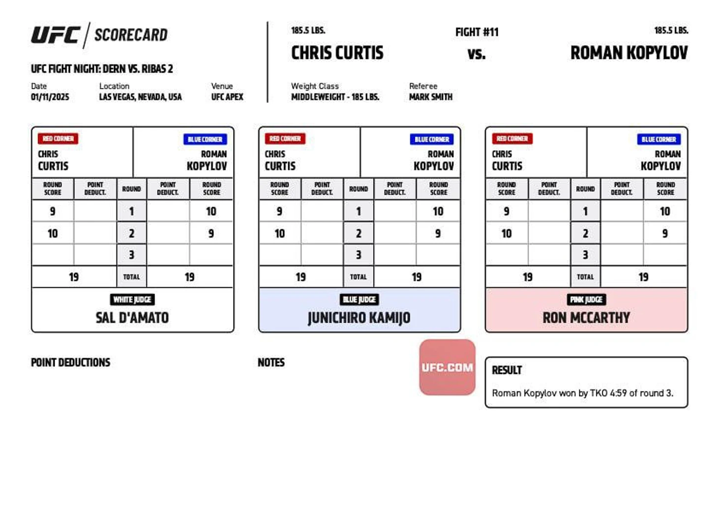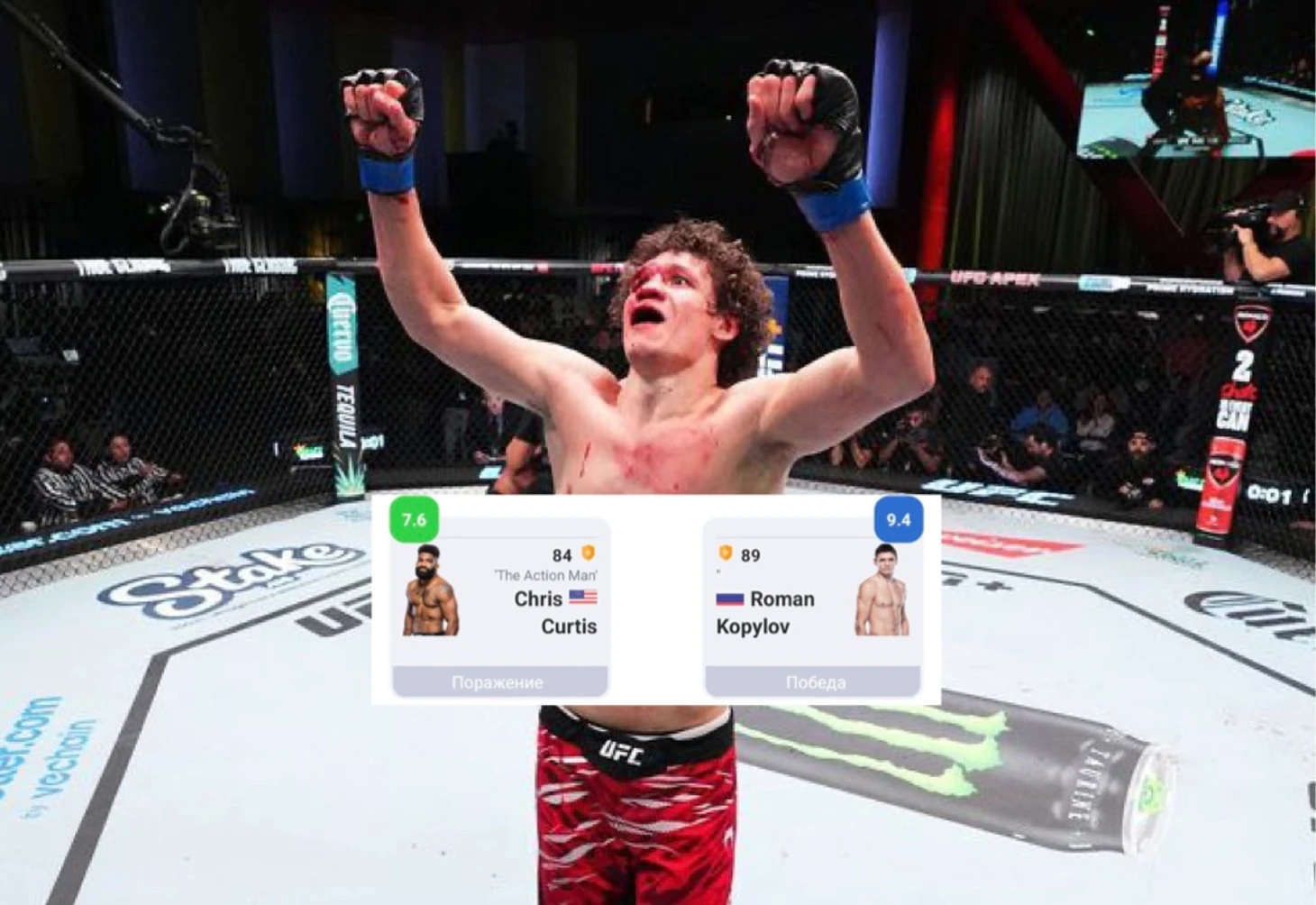 Роман Копылов показал хорошее выступление. Большую часть боя он перебивал американца в стойке, работая разнообразнее и эффектнее. В связи с этим россиянин получил высокую оценку за выступление от Stats Fight Performance – 9.4. Крис Кертис, в свою очередь, был наделен рейтингом 7.6 по итогам боя.