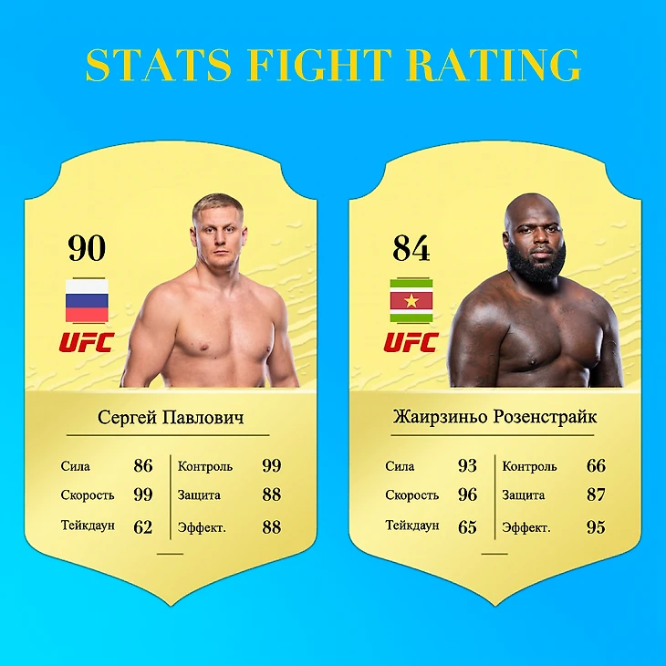 По данным Stats Fight Rating, бойцовский уровень Павловича значительно выше, чем у представителя Суринама. Навыки российского тяжеловеса наделены рейтингом 90. Жаирзиньо Розенстрайк отстает в этом компоненте от Сергея на шесть пунктов.