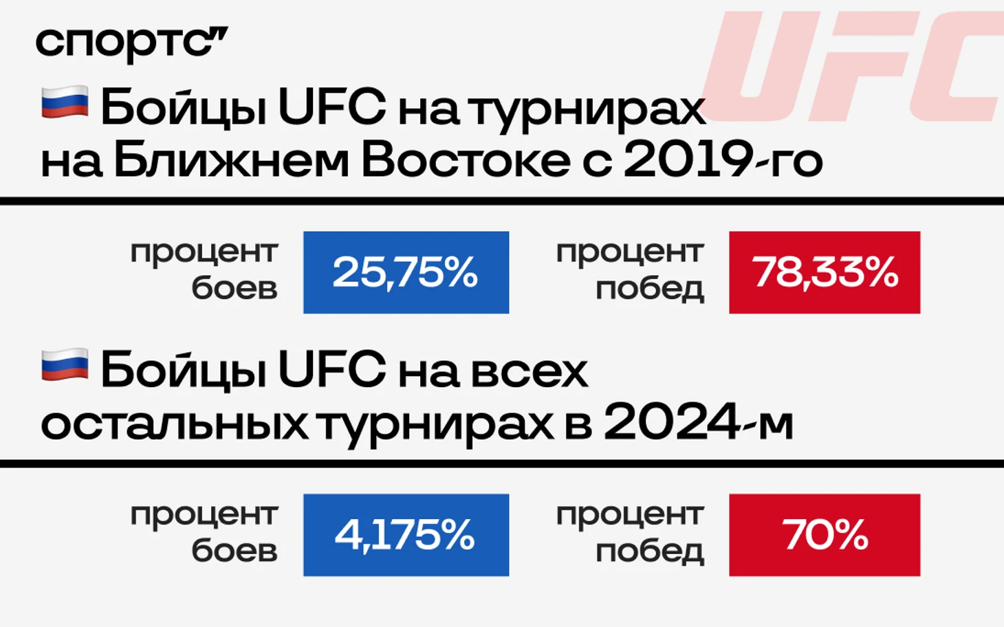 Мы подсчитали разницу между количеством поединков с участием наших бойцов в турнирах UFC на Ближнем Востоке и в других локациях. Получилась показательная процентовка: