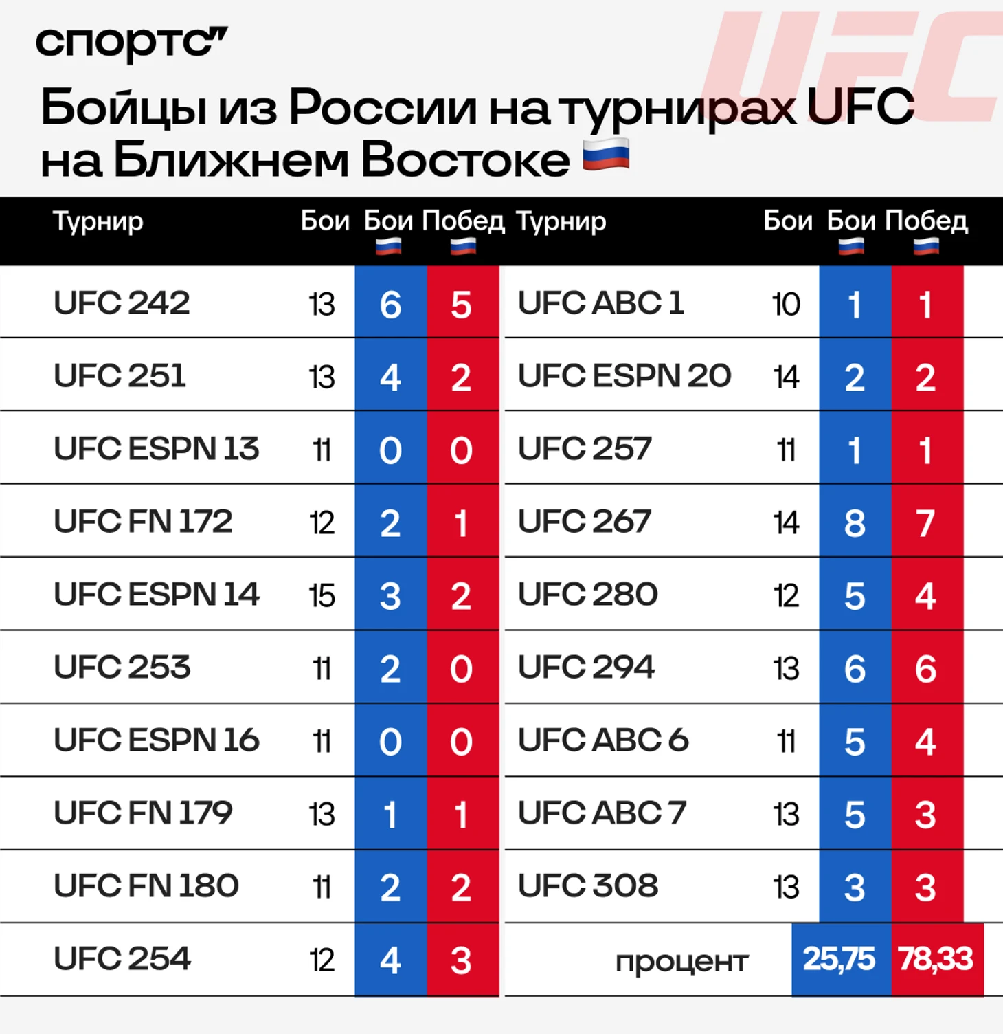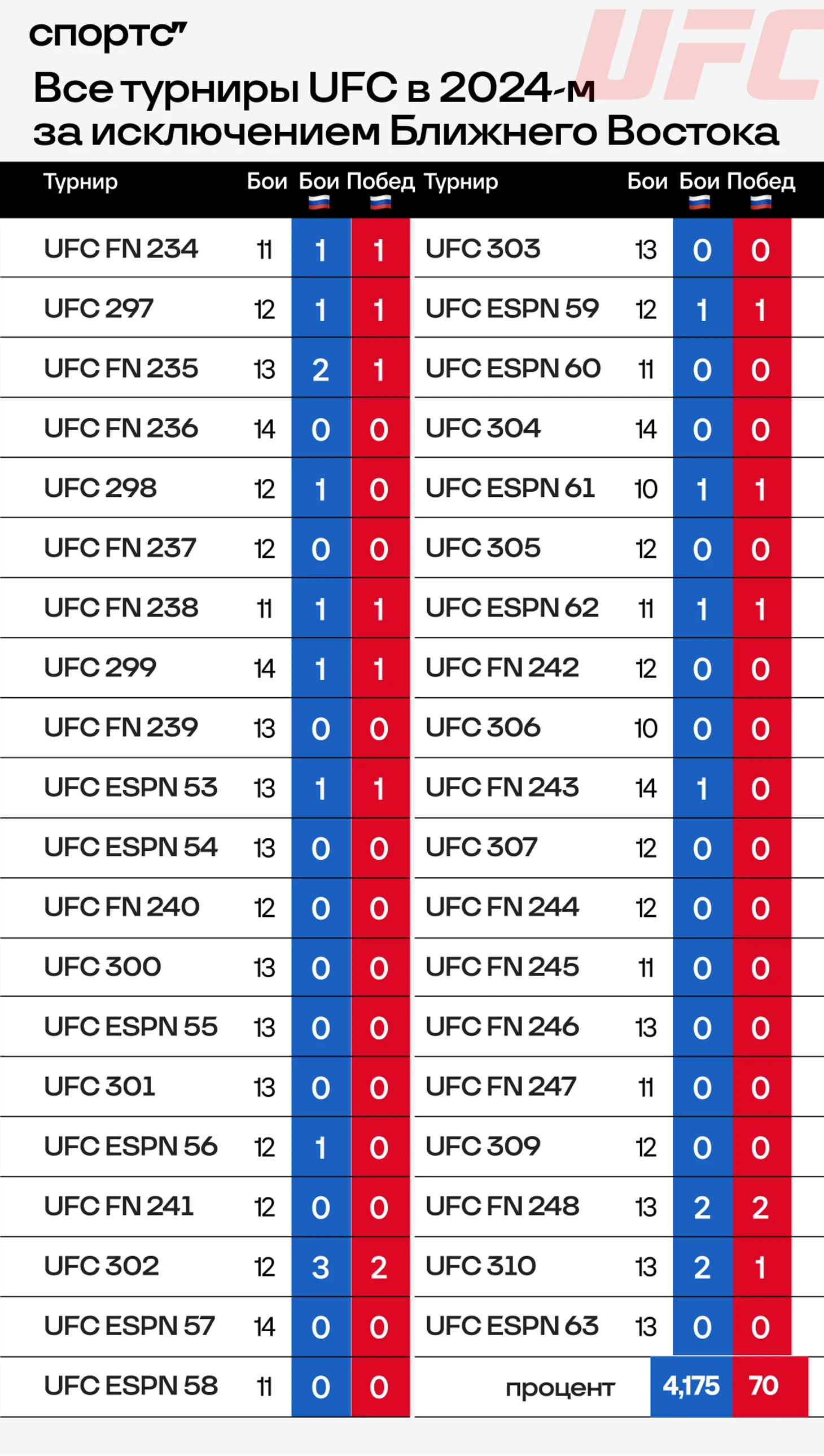 Мы взяли в выборку все турниры в ОАЭ и Саудовской Аравии, начиная с UFC 242 (Хабиб против Порье в 2019-м), и все турниры лиги в 2024 году (за исключением прошедших на Ближнем Востоке) и подсчитали процент побед наших бойцов в этих поединках. Как это выглядит детально: