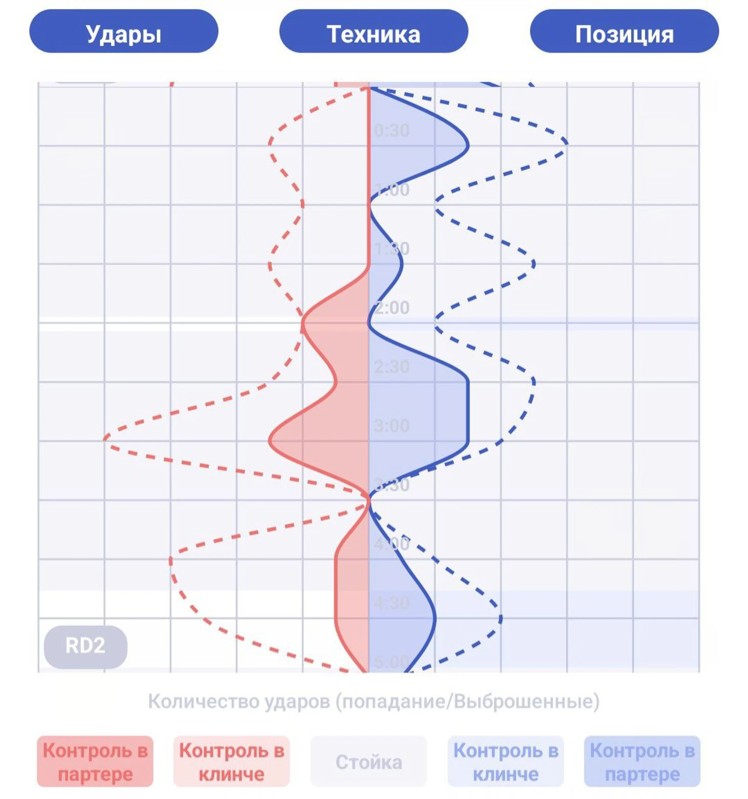 Во втором отрезке ситуация в октагоне особо не изменяется. Да, Шара пытается прессинговать Пейджа, работая первым номером. Но эффективности в действиях Магомедова нет. Уж очень классно перемещается Майкл. Вытягивая россиянина на себя, британец здорово атакует двойками и пробует колено в прыжке. Экран “Динамика поединка” отлично показывают, что ветеран перерабатывает Шарабутдина на протяжении всего раунда: