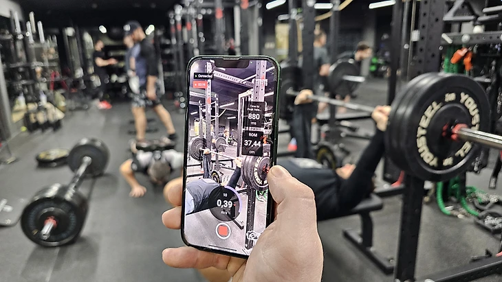Как жмут штангу от груди, видели все. Но сейчас Протасов берет небольшую коробочку, фиксирует ее на полу, вытягивает из нее тросик и цепляет к грифу с одной стороны. Прибор также сопрягается со смартфоном и передает на него скорость, с которой я поднимаю штангу наверх, и еще несколько показателей.