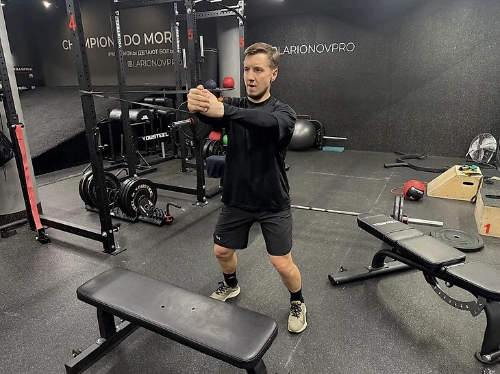 Когда обещали, что сейчас мы поделаем пресс, ожидания были намного лучше. На самом деле вышло сложное статическое упражнение. Ставишь ноги на ширине плеч, выпрямляя руки в замке и держа перед собой резину, натянутую перпендикулярно линии рук и закрепленную справа от себя (потом разворачиваешься и меняешь сторону). Задача – усилием мышц кора как можно строже держать ось и не разваливаться.