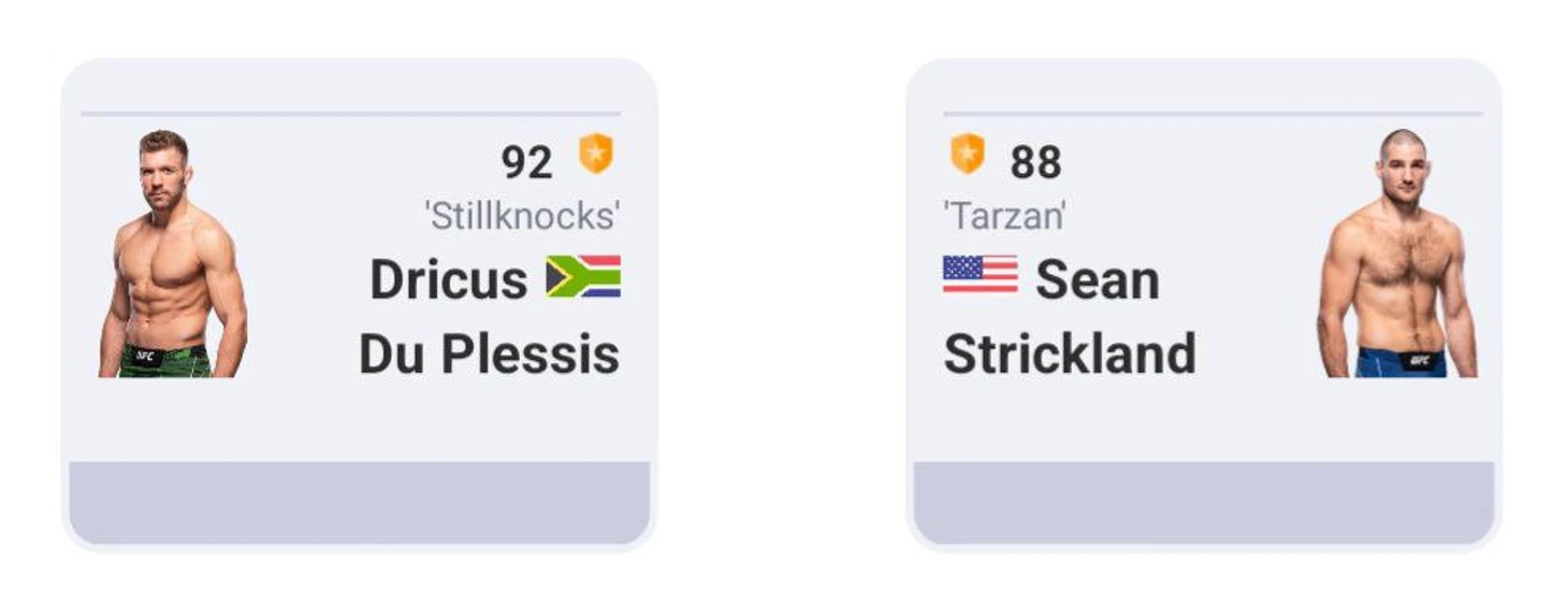 По данным Stats Fight Rating, Дрикус Дю Плесси имеет более высокий бойцовский уровень. Навыки действующего чемпиона UFC оцениваются рейтингом 92. Шон Стрикленд отстает от своего соперника на четыре пункта, имея рейтинг 88.