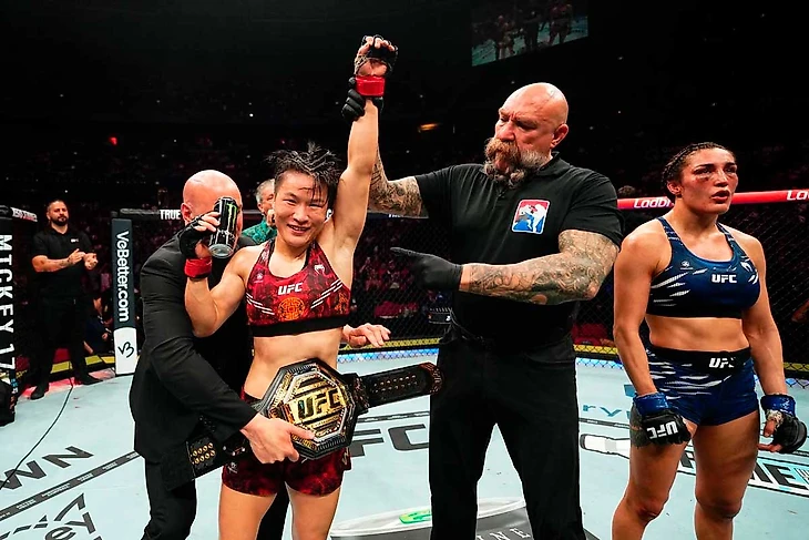 В ко-мэйнивенте доминирующая чемпионка веса «соломинок» Вэйли Чжан встречалась с Татьяной Суарес, прозванная «Хабиби» за выдающиеся борцовские навыки. Первые минуты остались за Суарес. Она сумела провести тейкдаун и почти весь раунд контролировала чемпионку на канвасе. Однако попытка провести гильотину привела к тому, чтоверху оказалась Чжан. Отыграть преимущество Суарес ей не удалось, однако она продемонстрировала претендентке, что вполне способна сражаться с ней на ее территории. Во втором раунде Чжан удавалось избегать борьбы. В стойке она спокойно перебивала Татьяну. Начал сказываться простой: в последний раз Суарес выходила в октагон почти два года назад. По мере того, как силы оставляли ее, Чжан все увереннее прибирала инициативу к рукам. Уже в третьем раунде стало понятно, что она своё не упустит. Суарес так и не смогла навязать сопернице привычный вязкий стиль боя, а без любимой борьбы смотрелась, как рыцарь, который вышел сражаться на турнире со щитом, но без меча. В итоге, китаянка уверенно забрала четыре раунда из пяти и отстояла свой титул.