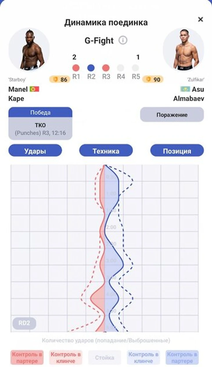 Во втором раунде Манель Капе еще с большей агрессией идет вперед, стараясь прессинговать казахстанского бойца и зажимать того у сетки. Алмабаев, понимая, что бой уходит у него из рук, решается сменить геймплан и начинает работать откровенно вторым номером – на отходах. И это дает свои плоды. “Зульфикар” попадает чаще противника и, возможно, прибирает раунд. Экран “Динамика поединка” в приложении Stats Fight показывает, что по эффективности атакующих действий Асу был чуть лучше Капе на данном отрезке.