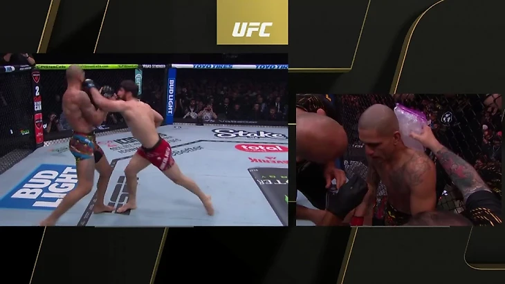 Особенно плохо у Перейры с блоком. Его практически нет. Вместо этого Перейра пытается реагировать оттяжками и чем-то вроде парирования, но получается слабо. Анкалаев несколько раз вскрыл его оборону молниеносными прямыми: