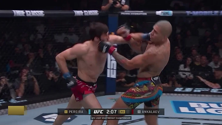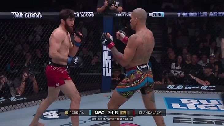 Анкалаев реагирует двойкой. Левый прямой залетает в обход руки Перейры точно в челюсть